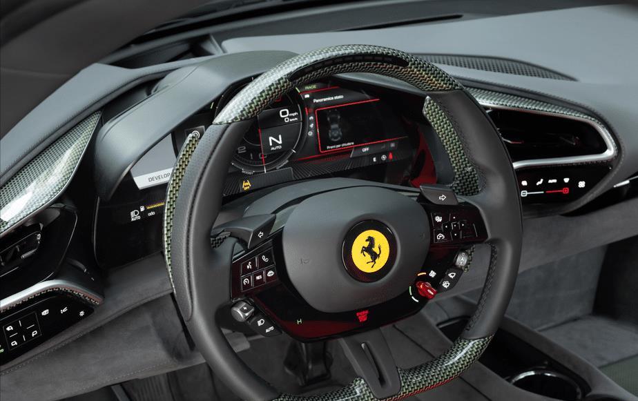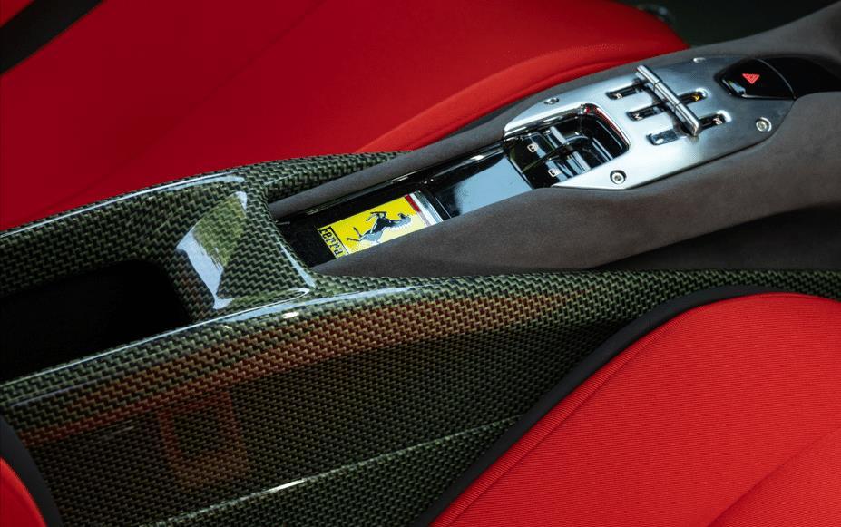 内饰方面同样讲究。与F40相似,SC40大量采用碳纤维与凯夫拉材质铺陈整个座舱,方向盘、换挡拨片及空调出风口皆以此材质打造。不过,其整体布局仍与296 GTB保持一致。